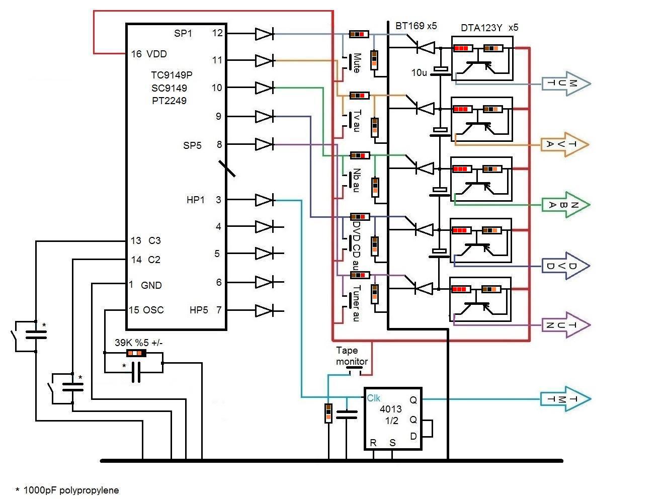 Açma-kapama, mute, source selector kontrolleri için uygun çıkışlar; Single Pulse çıkışlarından TC9149P de 5 adet vardır.(single pulse, tek atım demektir. Çıkışına eklenecek bir D flip-flop ile aç-kapa çıkışları olarak kullanılabilir.)"