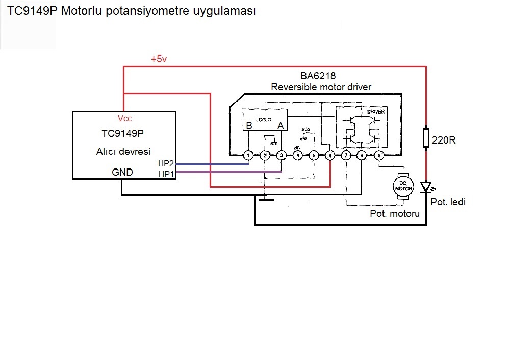 Ve en son denememiz; TC 9149P ile motorlu pot. sürme testi. Şemada yapılan bağlantı açıkça gözüküyor. Ben motor sürücü olarak BA6218 entegresini kullandım. test video.zip i indirip deneme videolarına bakabilirsiniz.
