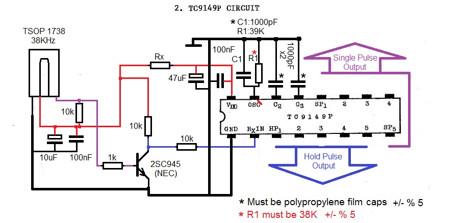 Alıcı sensörümüz TSOP 1738 den alınan kesik negatif sinyaller 2SC 945 imiz sayesinde pozitif sinyallere dönüştürülür ve güçlendirilir. Sinyal, TC9149P nin Rx pininden giriş yapar. TC9149P, dışarıdaki 39K direnç ve 1000pF kondansatör ile 38KHz civarı bir osilatör frekansıyla çalışır. Code Bit pinleri TC9148P ile uyumlu çalışma için ayarlanmalıdır. Ben herhangi bir ayarlama yapmadan çalıştırdım. Hold Pulse ve Single Pulse çıkışlarından 5 er tane vardır. Uzaktan kumanda da soldan en üstteki tuşa basılınca HP 1 den sürekli bir pulse çıkar ve tuştan parmağımızı çekene kadar da çıkmaya devam eder. Uzaktan kumanda da orta sıradan en üstteki tuşa basılınca SP 1 den kesik tek bir pulse çıkar.