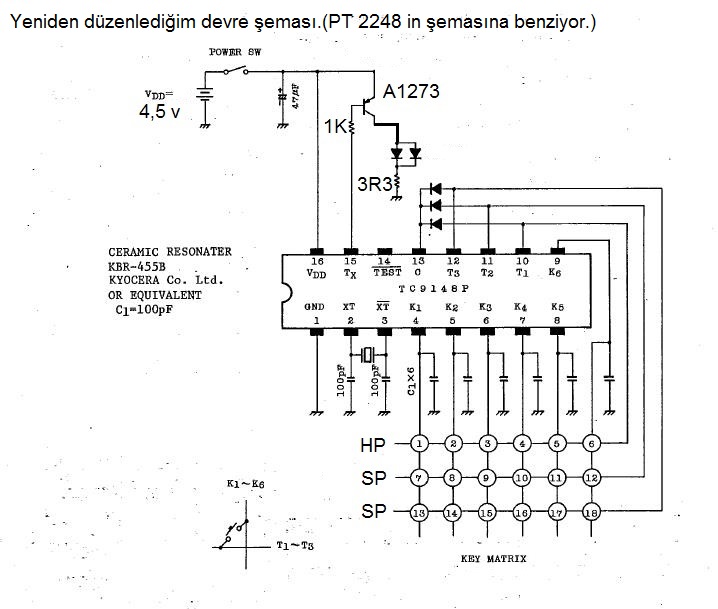 TC 9148P entegresini masaya yatırdım bugün. Bir deneme prototipi oluşturmak için delikli karta kurdum devreyi. Tek seferde çalıştırdım. Çalıştırdım da, çok kısa mesafeden sinyal gönderiyordu (ykş 50 cm). Standart devredeki 2sc1815 i 2sc1959 ile değiştirip denedim,olmadı. 3 kalem pille besledim, yine olmadı. Paralel led ekledim,yine olmadı derken; ne akla hizmetle kullanıldığını idrak edemediğim 2SC1815 transistörünü iptal ettim. 2SA1015 i daha güçlü transistörle, ??A1273 (Japon standardı sanıyorum,ama emin değilim) ile değiştirip, beys direncini 10K ohm dan 1K ohm a düşürdüm. 2 IR Led i paraleleyip tekrar 3 pille denedim. Veeee devre resmen coştu. Yaklaşık 5 metre mesafeden, benim el yapımı IR RC checker (uzaktan kumanda test aleti) i öttürüyordu.