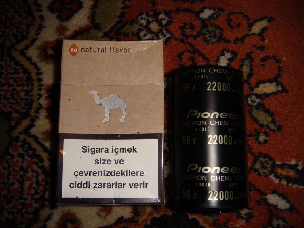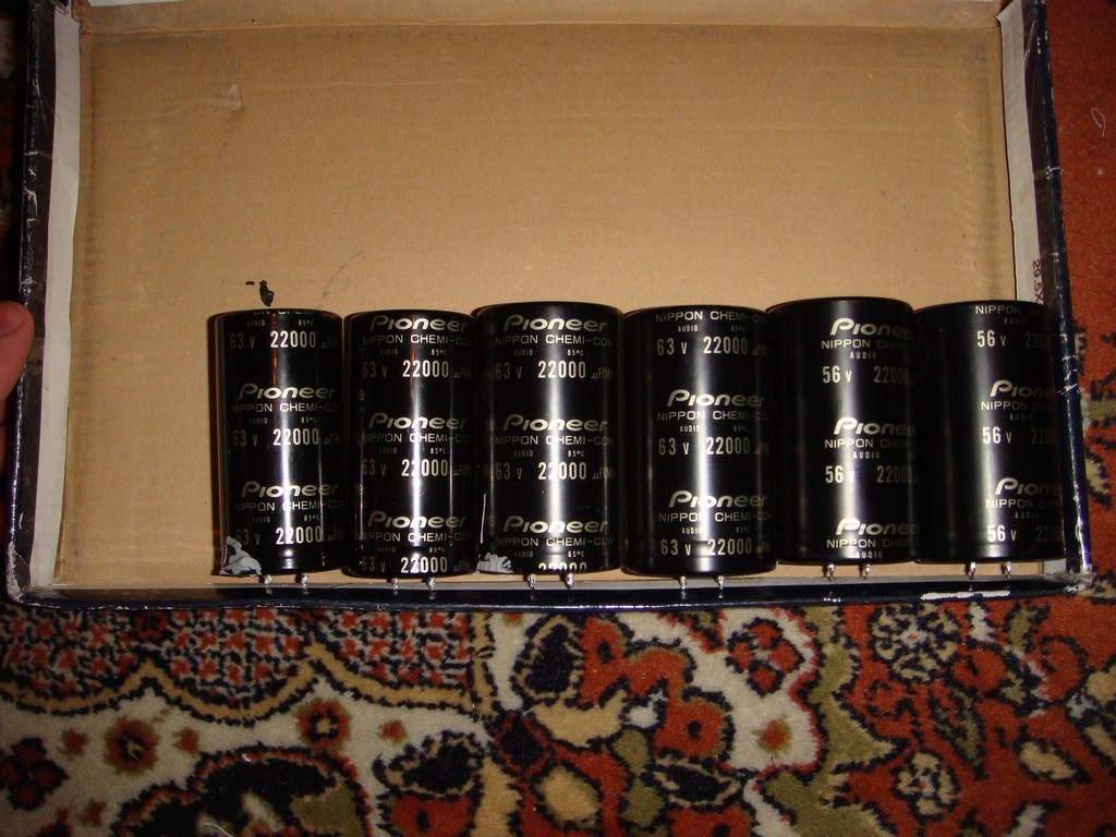GC için piyasada kaliteli kondansatör bulamadıktan sonra, pioneer yetkili servisinde çalışan bir tanıdıktan yardım istedim o da sağolsun birkaç tane bulup getirmiş, ben çift trafo kullandığım için aynı kondansatörden 4 adet istemiştim, getirdiği kondansatörler pioneer için nippon chemi-con tarafından üretilmiş, ve anladığım kadarıyla audio grade ürünler, 4 tane 22,000uF/63V, 2 tane de 22,000/56V var, yalnız durum şu, 63V olanlar ikişerli olarak farklı amplilerden çıkma, dolayısıyla 2 tanesinin ebatı diğerlerinden farklı, voltaj ve kapasitans değerleri aynı da olsa özdeş değiller yani, tam simetrik yapı istediğimden ufak bir tereddüde düştüm, bunları ne şekilde kullanırsam en iyi sonucu alırım, ikişerli eş grupları birlikte mi kullanayım yoksa farklı olanları mı eşleyeyim, ya da farketmez mi?