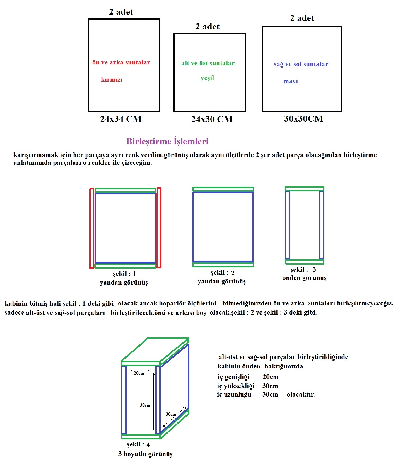 kabinin ölçülerini çıkardım.marangoza sipariş verdim.sunta kalınlığı 2cm.arkadaş sadece kesim işlemlerini yapacak.birleştirmeyi ben yapacağım.birleştirmede orjinal tutkal ve vida kullanacağız.