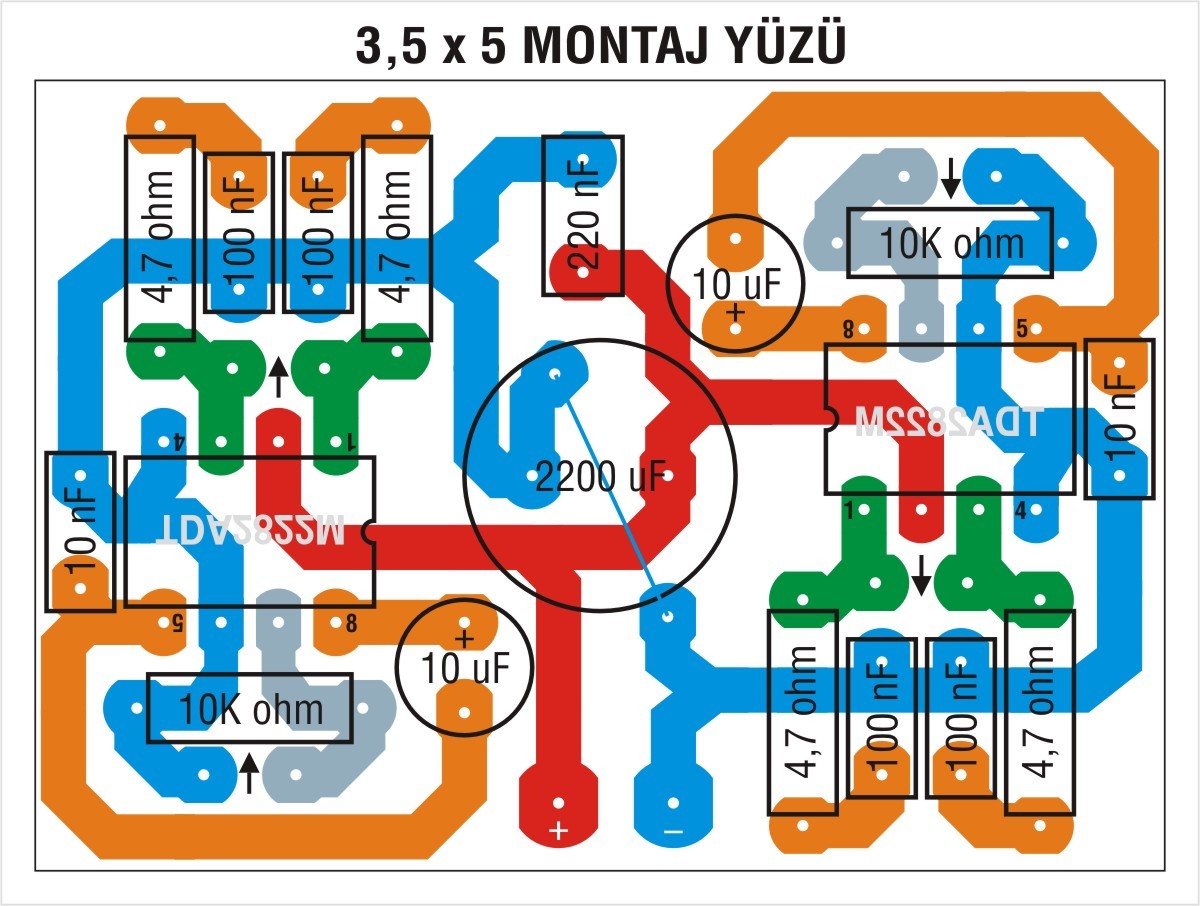 TDA 2822 (16 uçlu olanı) köprü olarak uygulayacaksanız, ilk önce 9v ta 8 ohm luk hoparlöre tipik olarak 3.2 w vereceğini bilmelisiniz. Yani kullanacağınız hoparlörlerin empedansı düşük geleceğinden, minimal olarak 8 ohm kullanılan çıkışı zorlayıp yanmasına neden olabilir. Ha, iki adet 4 ohm hoparlörü seri bağlayıp 8 ohm yapacağım diyorsanız, yazdıklarımı dikkate almayın.