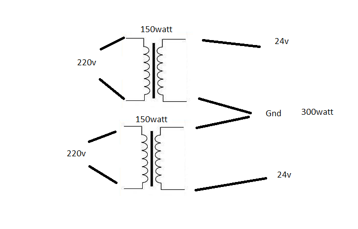 iki adet 24 volt 150 watt'lık trodial trafoyu şemadaki gibi baglayıp simetrik 300watt olarak kullanabilirmiyim ?