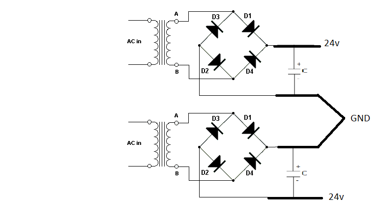 Her trafonun çıkışlarına birer tane köprü diyot bağla ve besleme devresinin çıkış taraflarından ortak uç yap.