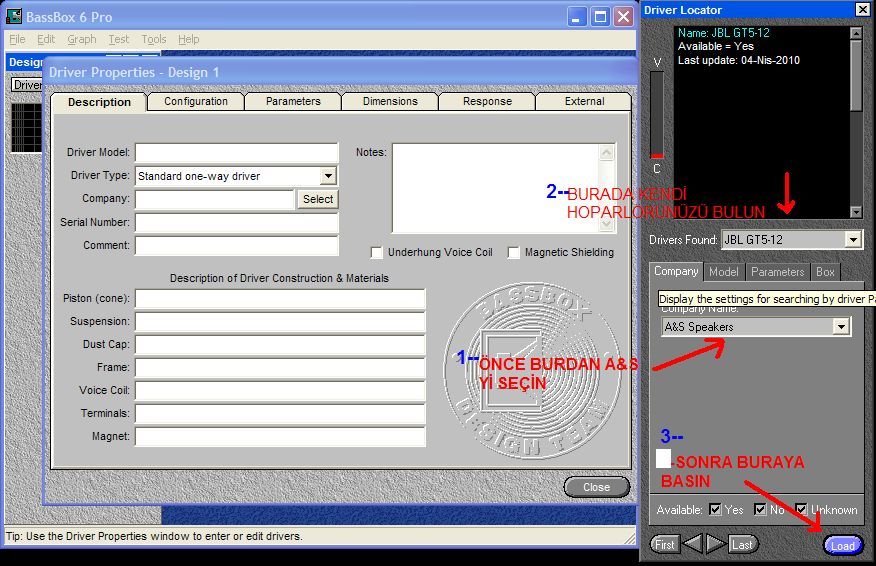 companyden A&S yi (en üstte) drivers found Yazan yerden sürücüyü seçin ve altaki load yazan kısımdan yükleyin sonra açılan kısımda yeşil yere tıklayıp accept deyin hoparlörümüzü yükledik şimdi sıra kutu tasarlamada