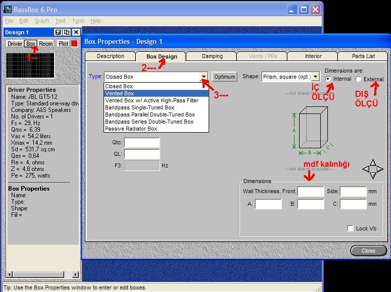 kutu tipini seçin( closed vented bandpass) optimize edin size Vb yazan yerde litre hesabı vercektir wall trickness yazan kısma 18 mm olan MDF kalınlığını girin A: B C: yazan kısımlarda size ölçüleri verecektir yukarıda internel seçiliyse iç external seçiliyse dış ölçülerdir bunlar damping kısmından kutuya koyacağınız elyaf yada benzer maddenin tipini seçin. Vents kısmından