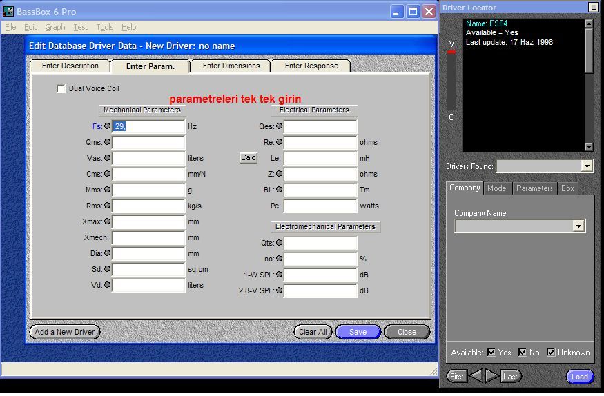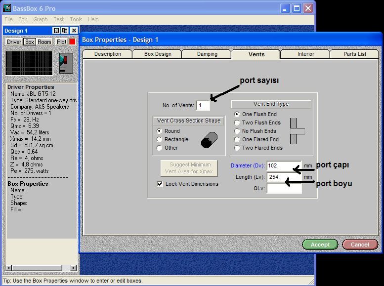 Kullanılan hesap proğramı Bassbox 6 Pro.