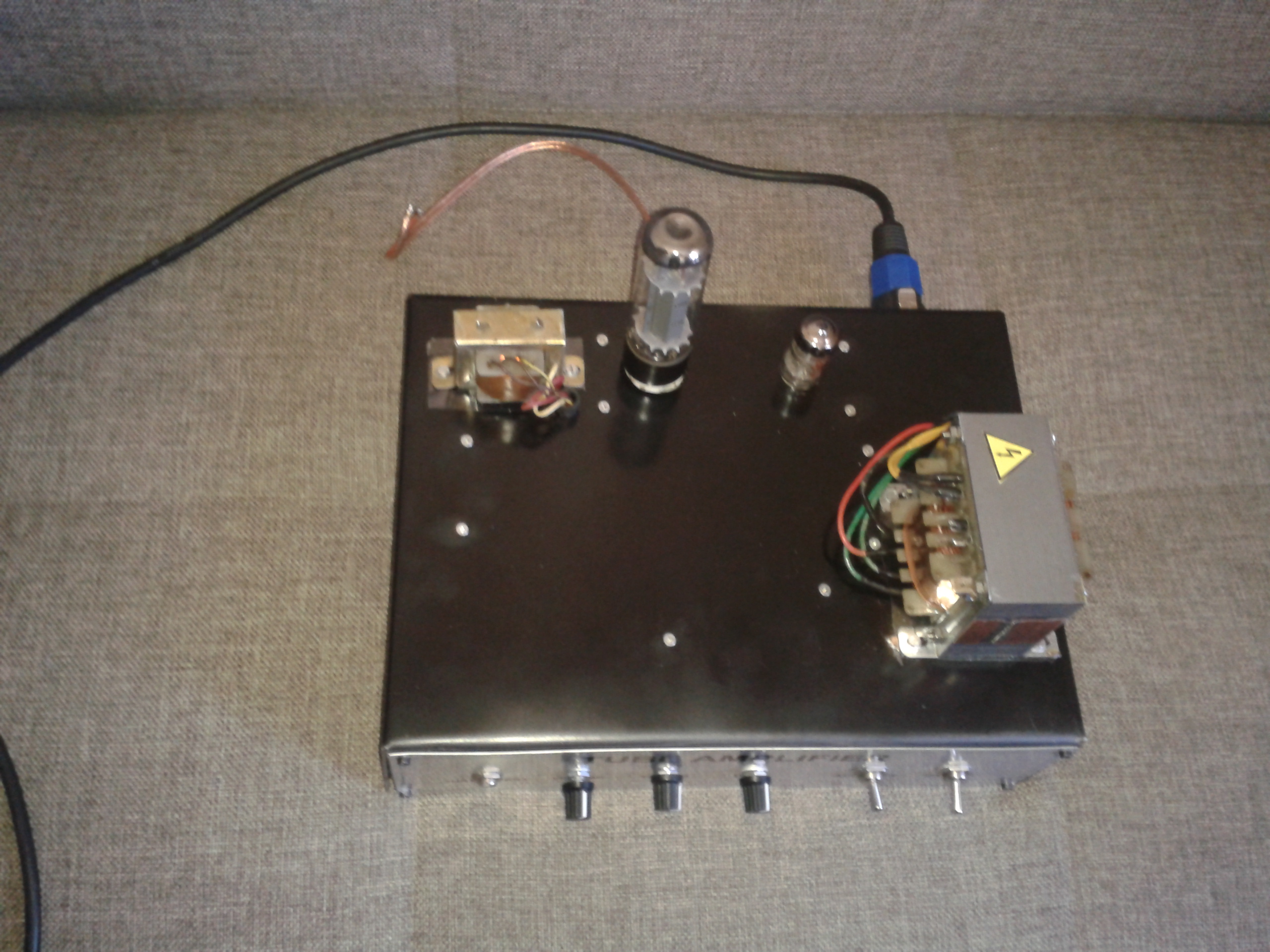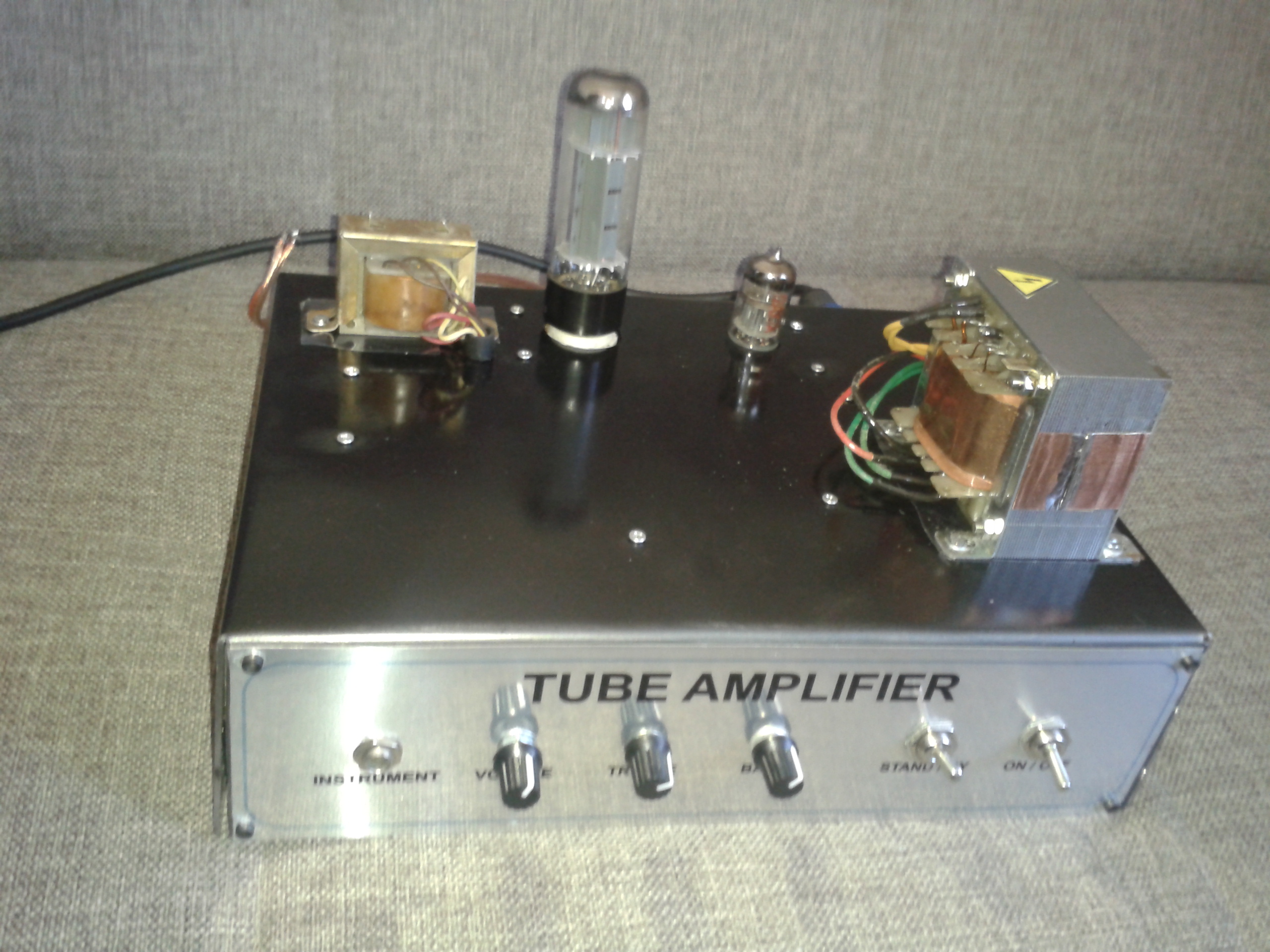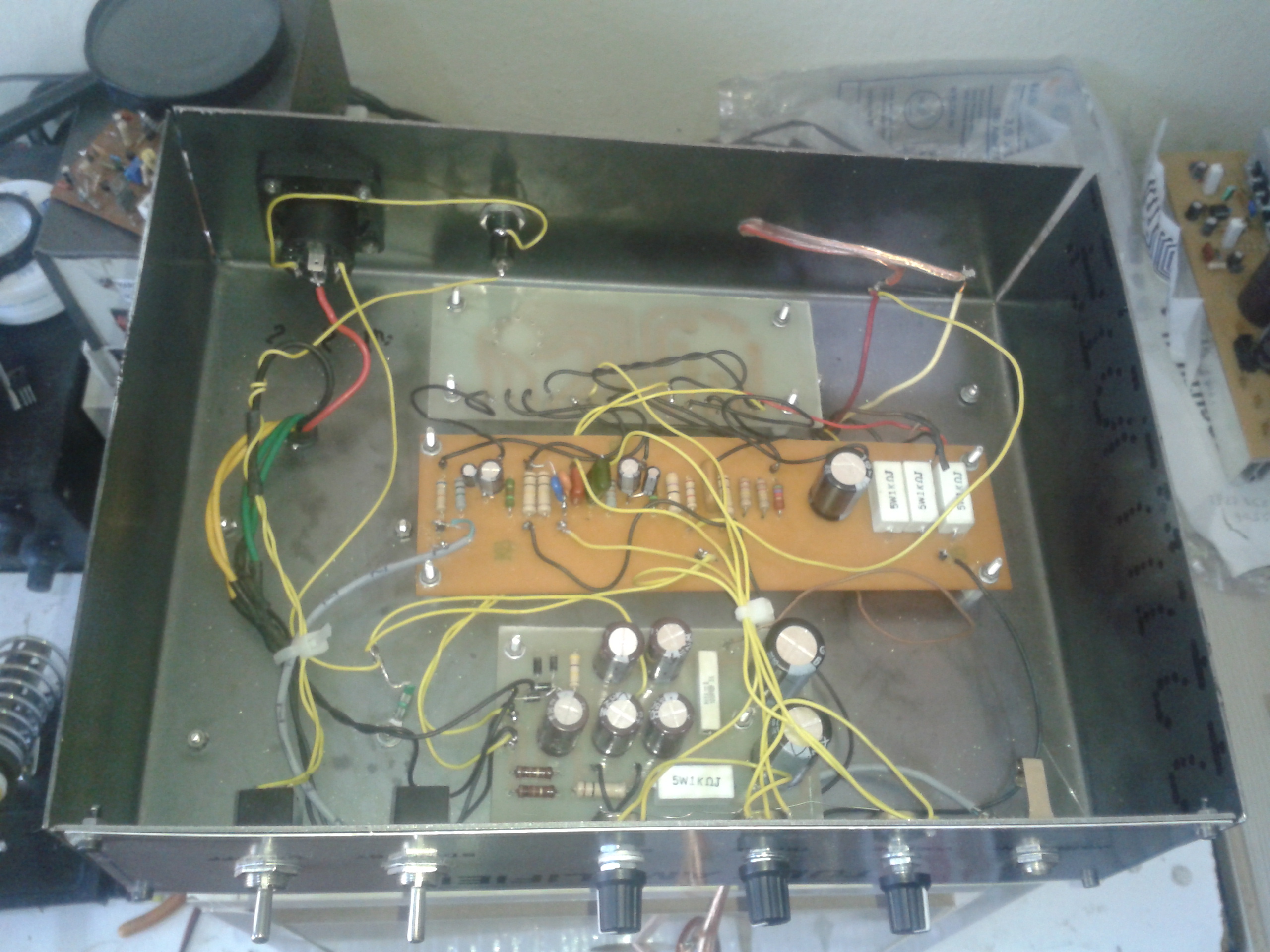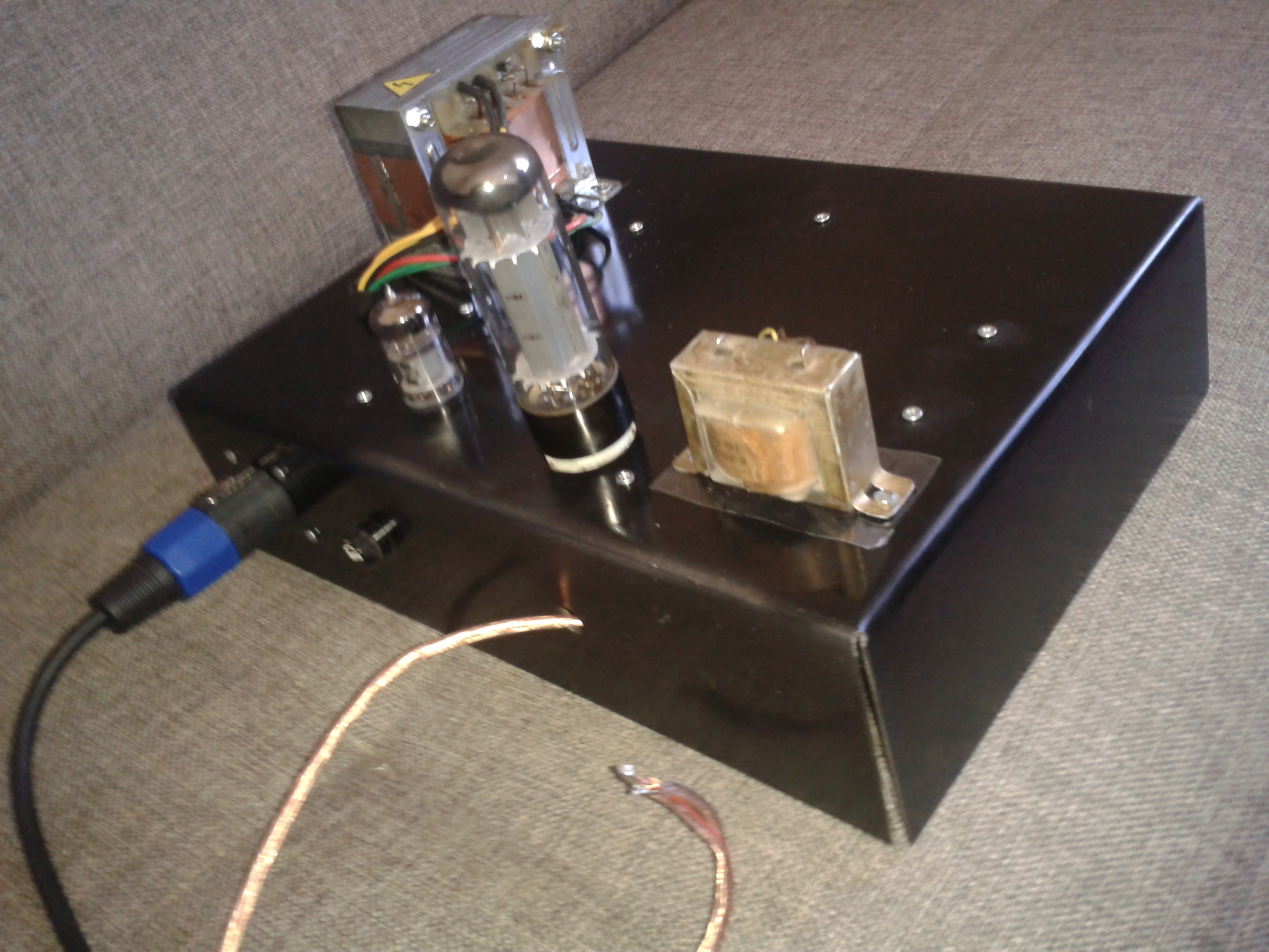 Elektrogitar & Elektrobağlama için yaptığım Amplifikatör çok iyi çalıştı.... Pedallar vede kasada bana ait tasarım olarak... Bu Amplifikatör için önemli olan çıkış transformatörü . Normalde El34tek başına 14watt güç veriyor... O yüzden çıkış trafosu 25-30watt olması gerekli.... Fakat bunu sardırabilecek yer bulamadım..... Eski bir radyodan çıkan Single Ended çıkış trafosu ( El84) için yapılmış. Empedansını bilmiyorum ama 500 ohm Dcr. Sekonder ise 1ohm empedans.... Tam uydu ve bu bana yeter bile. Fakat bu trafoyu parçalatmak istemedim aynı şekilde nasıl sarılır yada kim sarabilir? Birde hoparlörde eski radyodan çıkma . Kağıt hoparlör o yüzden çok yumuşak sesi var. Bu hoparlörden nereden buluruz ? Kasaya koydum vede kasanın önünü nasıl kapatabilirim bir kaç soruma umarım yanıt bulabilirim....