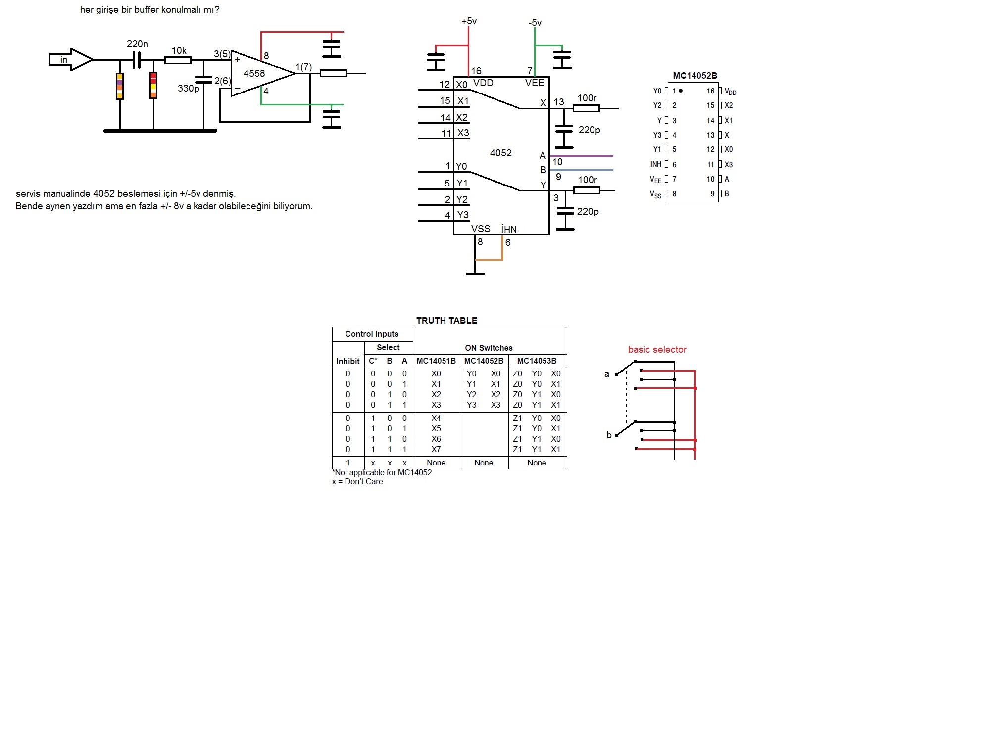 Bir süredir 4052 (Standart CMOS logic) ile audio kontrolü ile ilgili çalışıyorum. Bang of Olufsen TV manualinden bir şema çıkardım. 4052 nin kontrol girişilerini falan anladım. Anlayamadığım tek konu, her girişe bir buffer konulması şart mı?