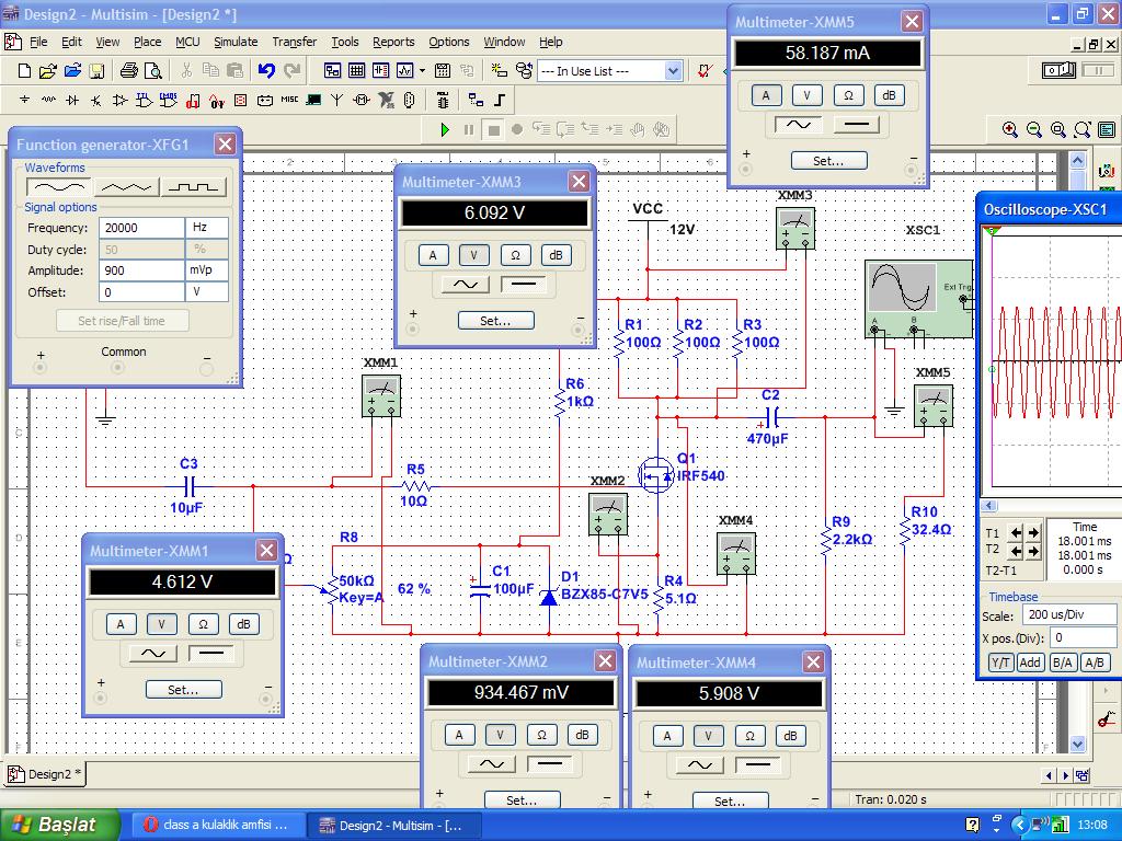 Benim yaptığım 4.6 voltluk ayarda giriş duyarlığı 1V maximum oldu...Buna göre de 100 ohm luk dirençlerden geçen akım(maximum 0.4 ampere dayanıklı ;dirençlerin toplamı 6Watt; gerçi 3 er watt'lık kullanılsaymış daha iyimiş) arttı onun için ısınmıştır.Ama hesaplara göre ve programdaki 100ohmların üzerine düşen gerilimle; normalde dirençleri bozacak kadar akım akmamakta..Ama sinyal bozulmuyor ve sadece dirençler ve transistörün ısısı artıyor olması gerekli..5.1 ohmluk direnç ısınmıyordur fazla..Bu durumda 1000hertzlik saf sinüs sinyal ile çıkışta 32 ohmluk yüke 100 milivat vermesi gerekiyor...
