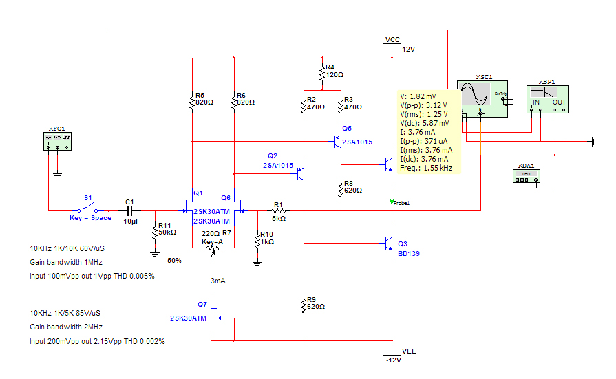 Çıkışa 1K yük bağladığımda sim. verisi elbette THD 0.05 civarına geldi.