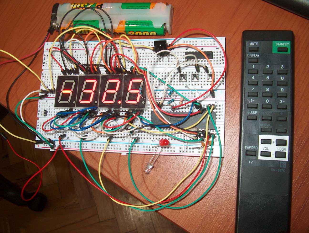 Ha tabi, en fazla uğraştıran kısmı kumanda kontrol desteği ekleme oldu. Düşündüğüm gibi 7 segmentli haline uzaktan kumanda kontrol eklememiz çok zor oldu. 7 segmentler multiplexing yöntemi ile sürülüyor (zorunda, yoksa 25 pin harcardık!) Aslında her seferinde sadece bir segment yanık kalıyor, ama bu işlemi saniyede 30x4 = 120 kere tekrarladığım için gözler hepsi aynı anda yanıyormuş gibi görüyor. Uzaktan kumanda okumak içinse oldukça hassas zamanlamalarda veri almak gerekli, ekranı sürmek de ekrandaki değer değişmese bile devam etmesi gereken birşey. Bu iki önemli iş aynı anda olamıyor maalesef, birbirlerinin zaman aralıkları çakışıyor. Oldurmaya çalıştım, yarın göreceğiz olmuş mu..