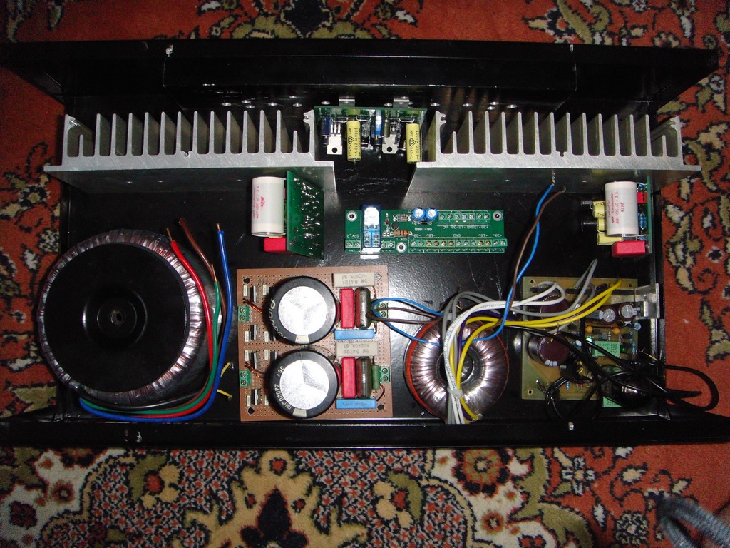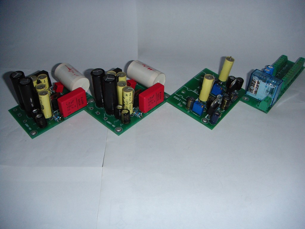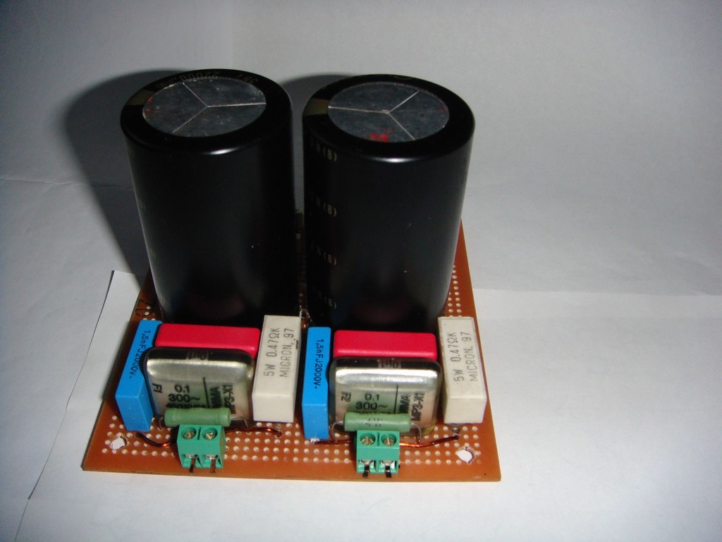 Bugün bikaç saatlik uğraşla güç kaynağı modülünü de bitirdim, biraz irice olsa da sağlam oldu. Diyotlar BYW-29 ve hepsi 100n poly. kond. ile bypass'lı, ana rezervuarlar pioneer'lar oldu (iyi ki rifa'ları kullanmamışım zira kutuda yer kalmıyor şu anki haliyle bile) ardından bypass için sırayla 1uF wima mkp kond., 100nF wima metalize kağıt kond., ero mkp1,5nF+0,47R 5W direnç ve son olarak 2,2k 2W direnç var.