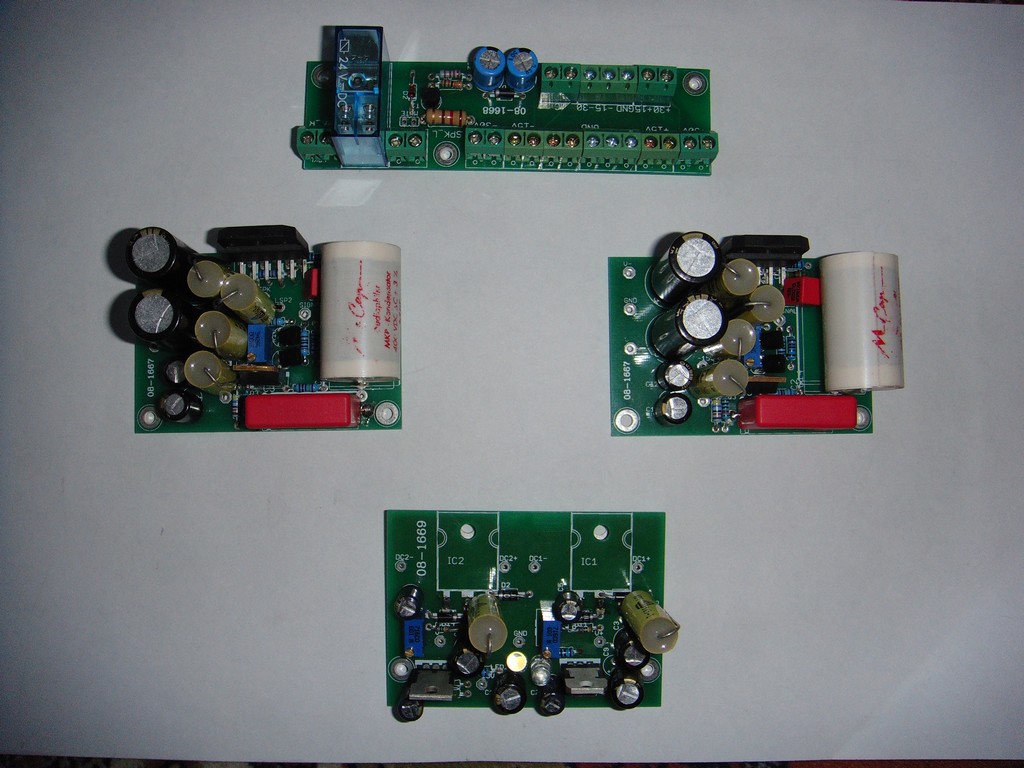 Bunun dışında daha önce de belirttiğim gibi, on board rezervuarlar ile regüle kartlarındaki tüm elektrolitikler panasonic fm ve fc serisi low-esr. Bütün 100n bypasslar rft mkp x2, bootstrap wima mkp 1uF %10 tolerans, sinyal kondansatörü mundorf mcap mkp 4,7uF %3 tolerans, 22n olan da wima fkp-2 %1 tolerans (teşekkürler Yıldıray ;) ) Bütün dirençler metalfilm, 1/4 watt, %1 toleranslı ve %0,1 içinden match edilerek kullanıldı.