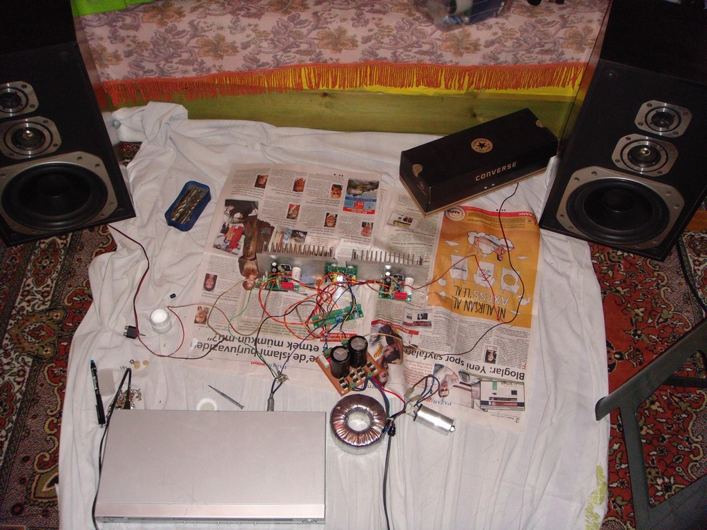 Bu çalışmayı yapmak ilk başta kafamda yoktu, sırf non-inverted gc ile kıyaslamak için yapmaya niyetlendim, toplu alımları, pcb leri filan kaçırmıştım. Bunları temin etmekte yardımcı olan Hazar, Emin abi, Yıldıray ve defalarca sorularımı yanıtlayan Dr. ile Erhan'a da ayrıca teşekkür ediyorum. İşte odanın ortasına saçılı vaziyette duran amplinin fotosu:
