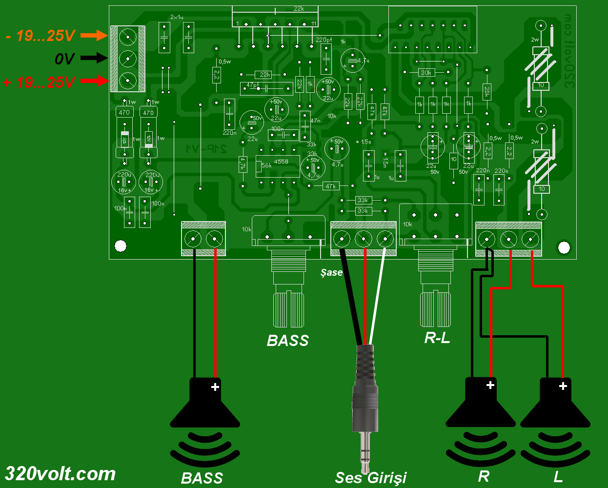 R-L- Çıkışlarında 10 ohm 2w diençlerin üzerinde bulunan bobin 1mm telden bir kalem üzerine 13 tur sarılarak yapılabilir ses girişinde saşeye karşı 2 adet 1.5nf kullanılmadı bilginiz olsun…