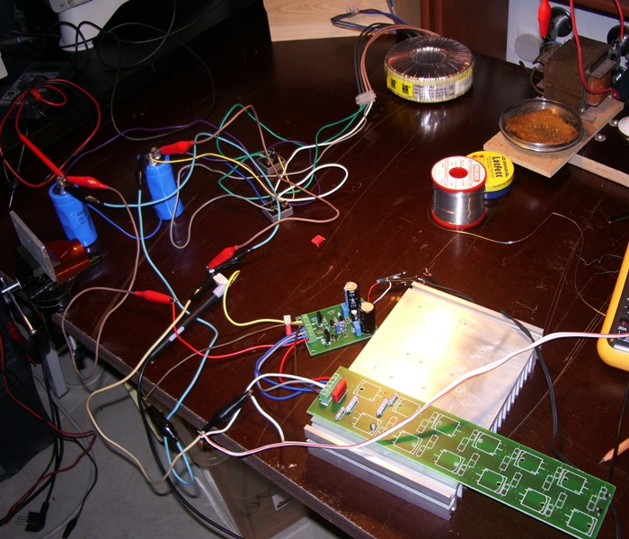 Kısaca şöyle. Ben ras100 ü yaptım. Çok beğendim. Ses kalitesi gayet başarılı idi. Bunun üzerine, Gökhanın da belittiği üzre, evdeki Magnepan höparlörlerimi çalıştırabilecek bir ampli yapmak istedim. Ras200 yada 240 mı herneise onu yapayım dedim. Ras ile mailleştik. Daha hazla güce ihtiyaç olduğundan besleme voltajını artırmaya karar verdik. Ben gittim paraya kıydım tormaktan, 2x70 volt 1kw trafo siparişettim. Aslangibi bir kutu tasarladım, dev soğutucuları Armadan aldım. Bu arada kutunun alüminyum malzemelerini gidip geridönüşünden çekilmiş lerden değil, 7075 kalite malzemeden yaptım. Buraya kadar herşey mükemmel gidiyorduki, devreye voltajı verince anladıkki bu tasarım 70v ile çalışmaya uygun değil. Hüsran. Nico da çok üzüldü tabi. Ben de birsüre ufak deneysel ampliler yaptım Lm3875 gibi. Aradan altı ay falan geçti herhalde, Nico sevindirici haberi verdi. Kendisini mesul hissetti galiba. Elimdeki trafoya göre bir ampli tasarlamış ve kendi sitesinde, bu ampli türk diy dostlarım Gökhan ve Ersoy için tasarlanmıştır şeklinde yayımladı. Aslında Gökhanın bu ampliye pekniyeti yoktu fakat yazışmaları o yaptığı için kendini bu projenin içinde buldu.