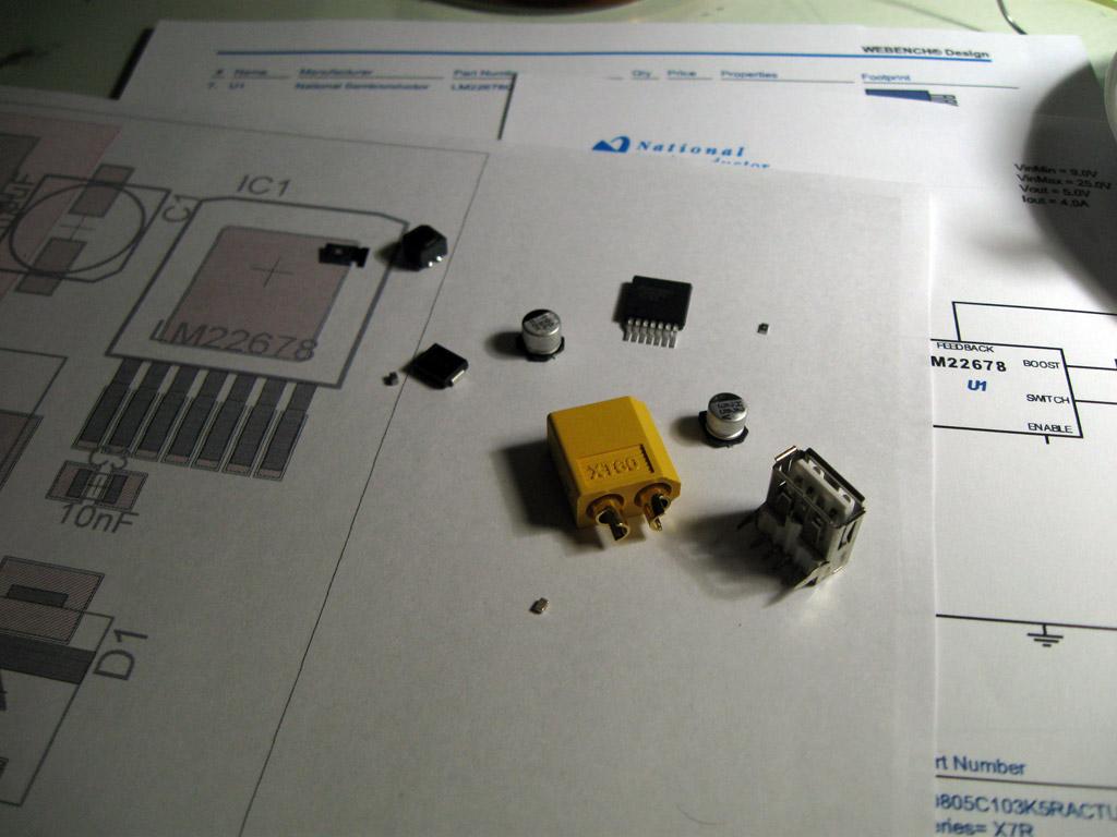 Başta telefonum olmak üzere bilimum 5V ile şarj olan "gadget"ımı yoldayken de şarjlı tutabilmek ve taşınabilir 5V 5A bir besleme yapabilmek adına National'ın LM22678 "5A SIMPLE SWITCHER®, Step-Down Voltage Regulator" entegresini kullanarak bir uygulama yaptım.