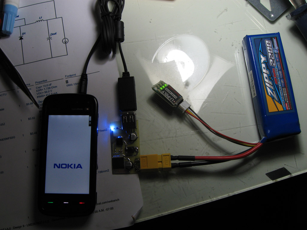 RC hobisi yüzünden elimde bulunan 3S lipo ile (ki kendisi tam şarjlı iken 12.6V verir) devreyi çalıştırabiliyorum. Pilin ucundaki konektörün tersini de karta lehimledim ki direk bağlayabileyim. Devrede herhangi bir batarya koruması bulunmuyor. O yüzden pilin balans ucuna hücre gerilimi ölçüp durumu ışıkla bildiren bir aparat taktım (elimde var idi). O üçlü yeşiller kırmızıya doğru dönmeye başladığında pil bitiyor demek. Devre (giriş kondansatörünün gerilimine dikkat edildiği sürece) 5.5V ile 42V (!!) arası bir giriş gerilimi ile çalışabiliyor. Ortalama verimliliği %92 civarı. Devredeki LED'i iptal ederseniz boşta 4mA çekiyor. Benim LED biraz parlak, o yüzden 11mA çekiyor