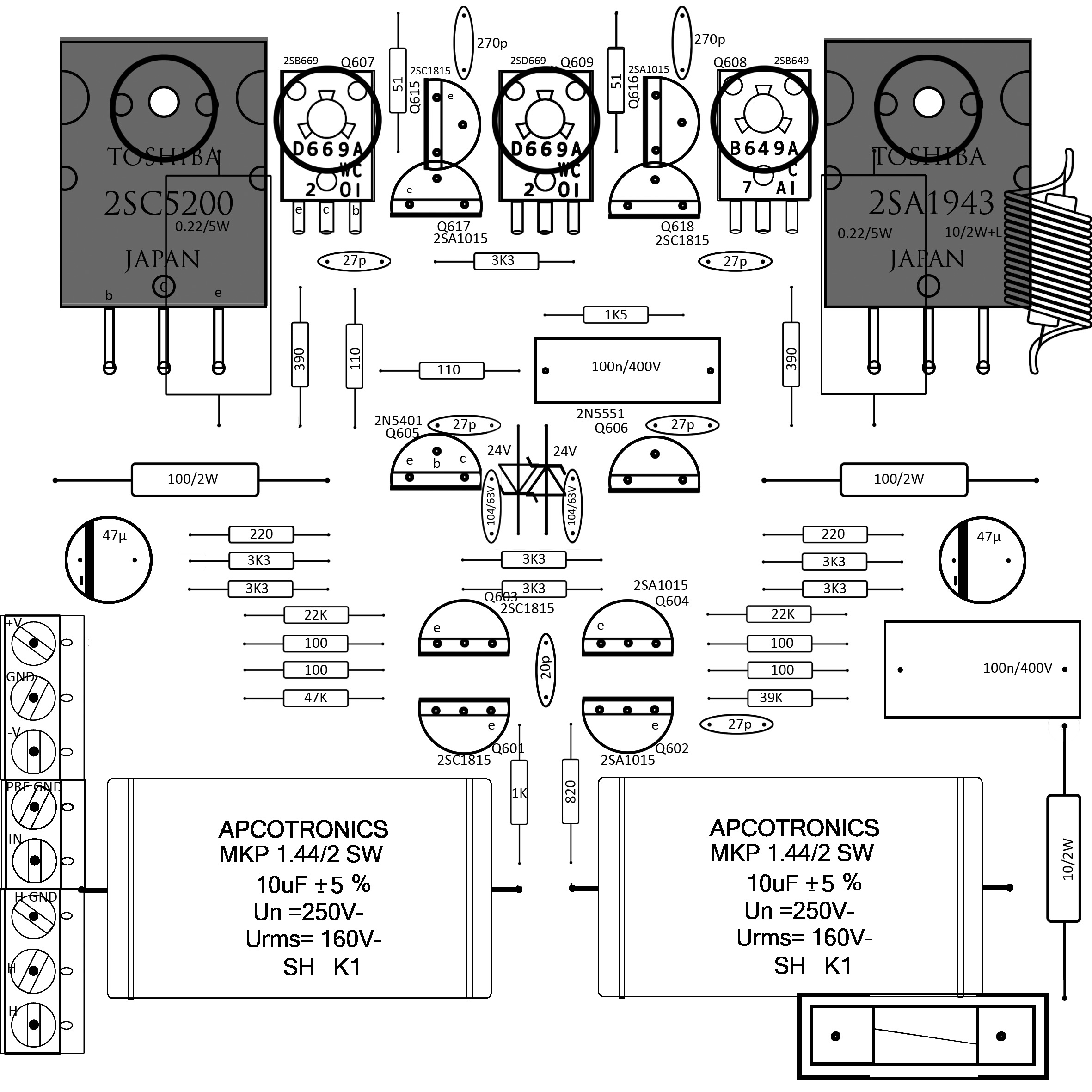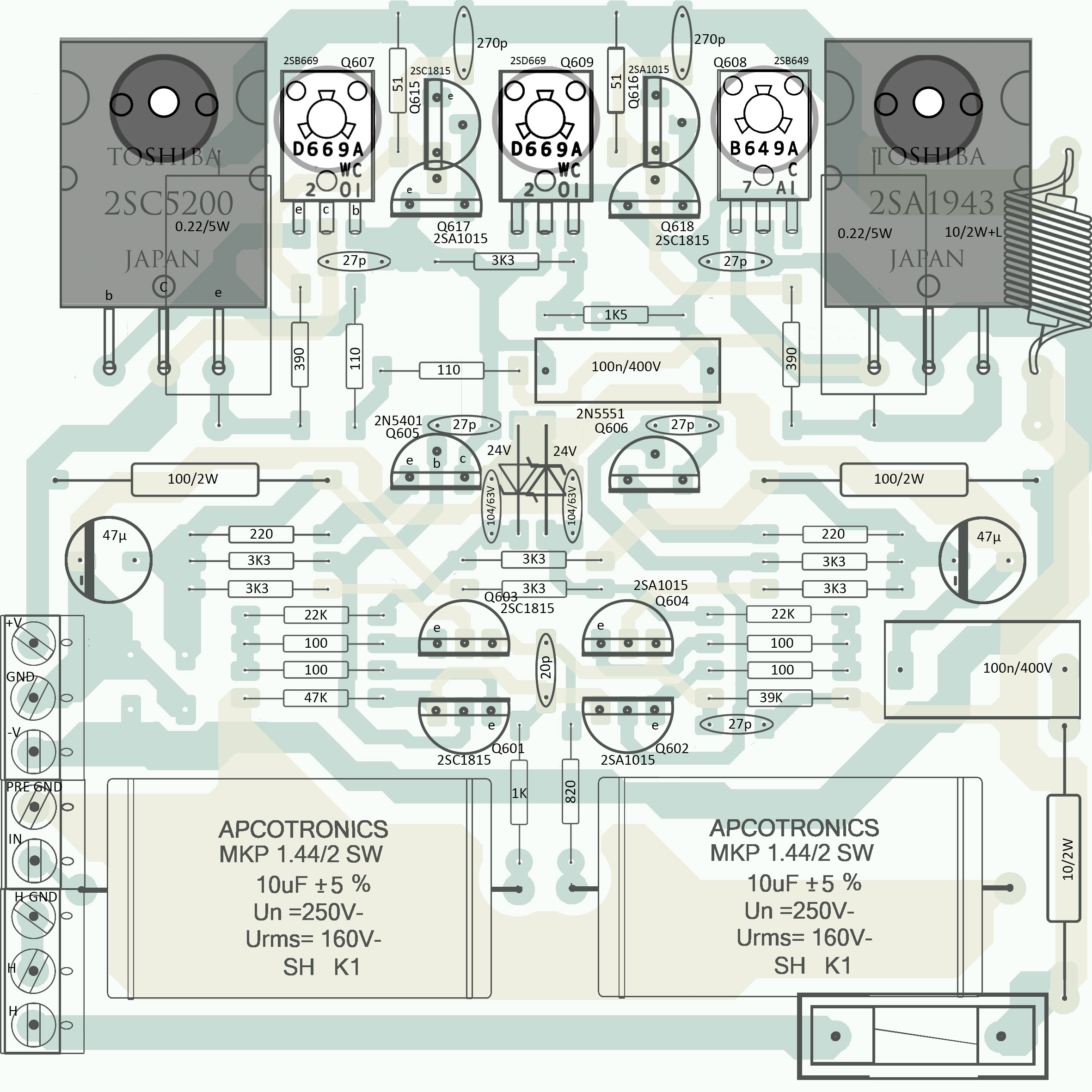 Arkadaşlar bir yerlerde bulduğum bu amplifikatör şemasından yola çıkarak pcb dizaynını yaptım. Çıkış transistörleri ve sürücü transistörleri ile bias transistörü plaketin altına monte edilip ana soğutucuya vidalanacak. Plakette tam transistörlerin üzerinde 5mmlik delikler açmak için boşluk bıraktım. Bu boşluklar kullanılarak transistörler soğutucuya çok rahat vidalanabilir.