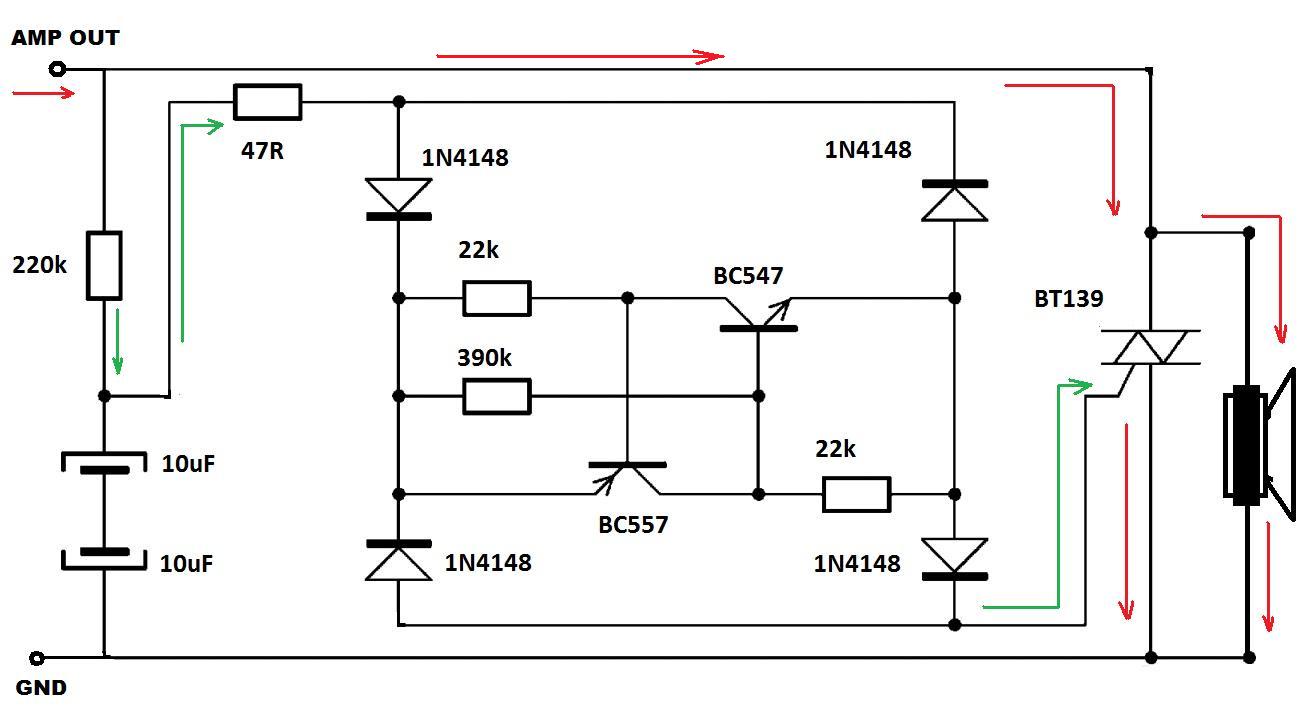 Apex'in bu devresinde; amplifikatör çıkışları arıza yaptığında hoparlöre bir DC gerilim geldiğinde hoparlörden yüksek akım geçecektir...İşte bu apex devresinde mevcut hoparlör yüküne geçecek yüksek akımı sınırlayacak(devre sayesinde akımı kendi üzerine alan çift yarım dalga yönlü triac ile...) bir devre bir nevi DC koruması...