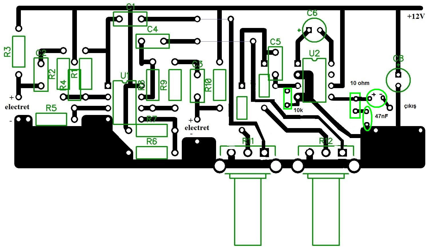 3 Şemada verilmiş olan 680nF kondansatörler daha geniş frekans spectrumu içindir. Bu kondansatörler yerine 100nF bağlamak sesin bas bölgelerini optimal seviyeye çekecektir. Üst frekans filtresi için ise R5 e parelel bağlanacak uygun bir feedback kondansatörü kullanılabilir. Takribi 470pF ila 1nF civarı.