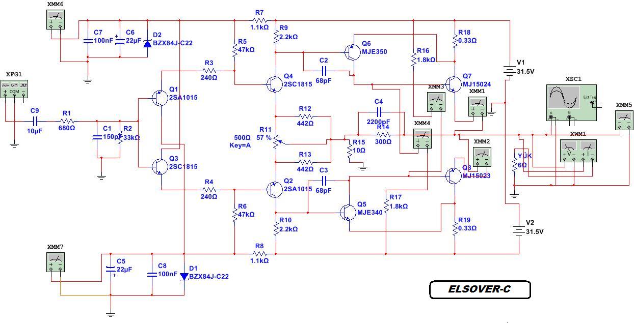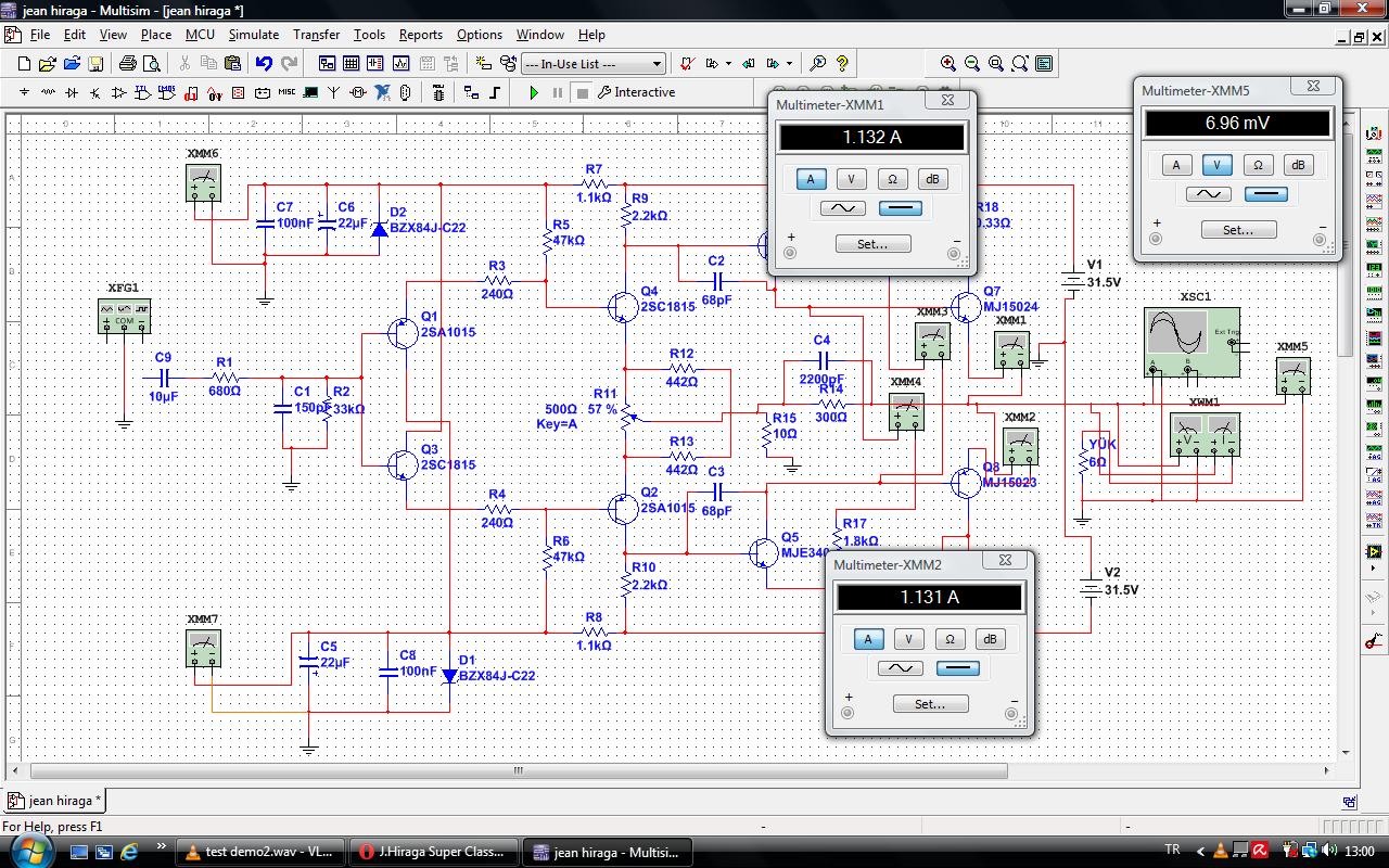 R3 ve R4 ü eşledim; çünki bütün elemanlar eşlenmiş simetrik iken bu dirençler neden farklı anlam veremedim...R9,R10 direncini yükselttikçe ;bu transistör ile A sınıfı çalışmada ;çıkış taransistör sabit bias akımı 1.1 ampere arttırılmış oldu..Multisimde ; orjinal jean hiraga'daki transistörler yok o nedenle farklı transistörler kullandım ve R9-R10 çiftini arttırdığımda ; sabit bias akımı da artıyor..Multisiminde, devre kurduktan sonra; devre yanlış ise hata verip altta yazıyla rapor veriyor..Zaaten osiloskoplar ve diğer ölçü aletleri yardımı ile devrenin tam çalışıp çalışmayacağı incelenebiliyor..Girişte 10 mf kondansatör kullanmam birşey değiştirmiyor...Zaaten, kullandığımız preamplilerin çıkışlarında kondansatör bulunuyor...