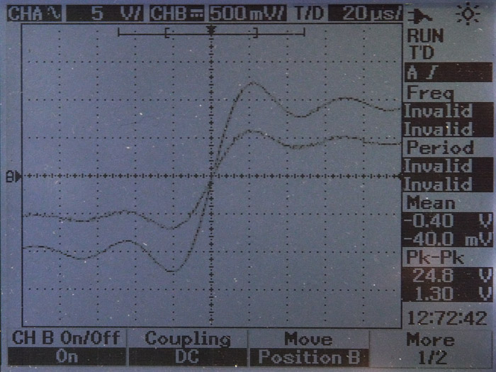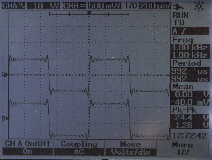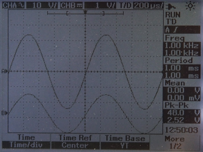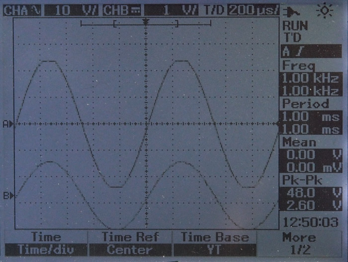 Çıkışta yüksüz 50Vpp, 48Vpp de 8 ohm yükte kesim öncesi ölçüldü.