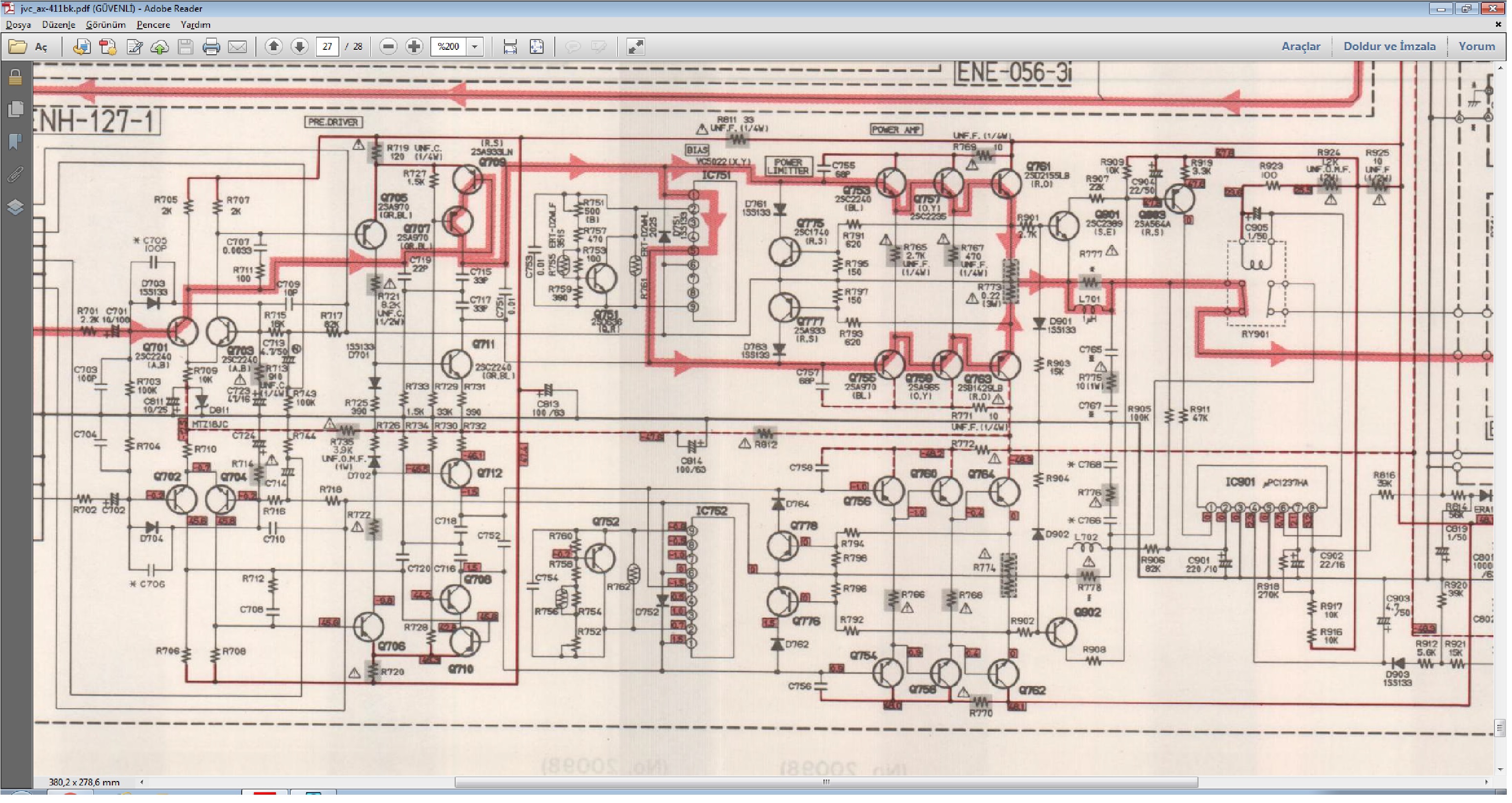 Biraz kontrol yaptım ve çıkış transisörlerine yakın olan 4 transistörü kontrol ettim Q757 , Q759 , Q753 , Q755 hepsini çıkarıp tek tek ölçtüm ve saglam çıktılar.Bunun neticesinde Tekrar çalıştırdım. Trafonun sigortası ile çıkış transistörleri tekrar yandı :) Çıkış transistörlerini söktüm ve anakartta çıkış transistörlerine giden yolları ölçtüm Q763 ile Q 761 emitörleri ölçünce kısa devre gibi gözüküyor ama çözüm bulamadım.